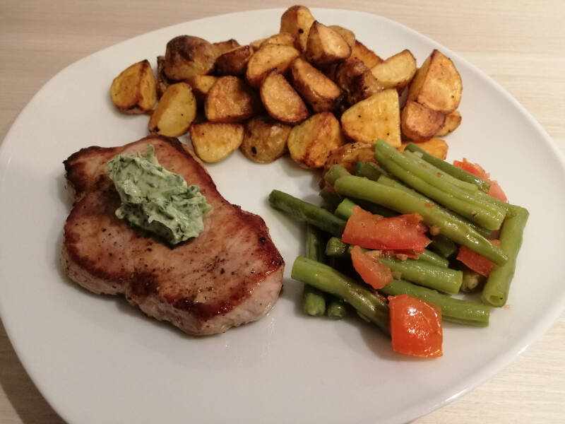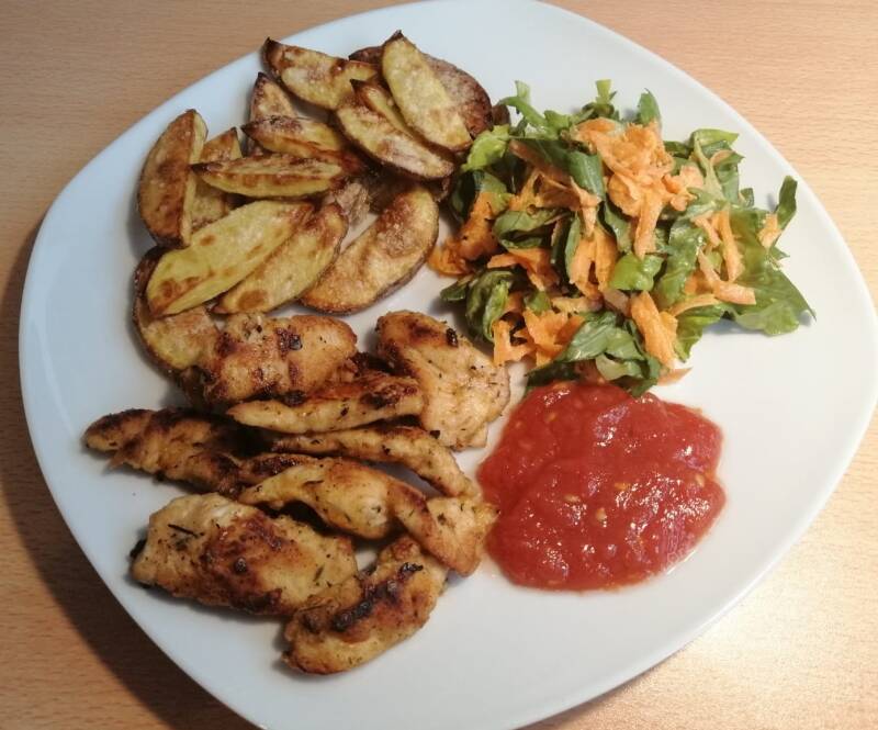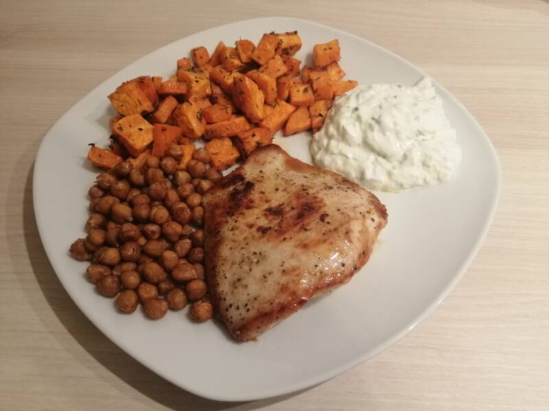 Putenschnitzel mit Kichererbsen, Süßkartoffeln und Aioli