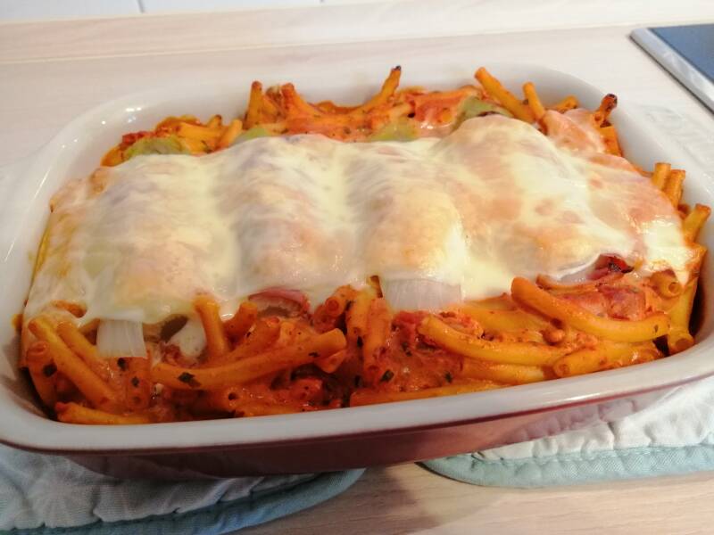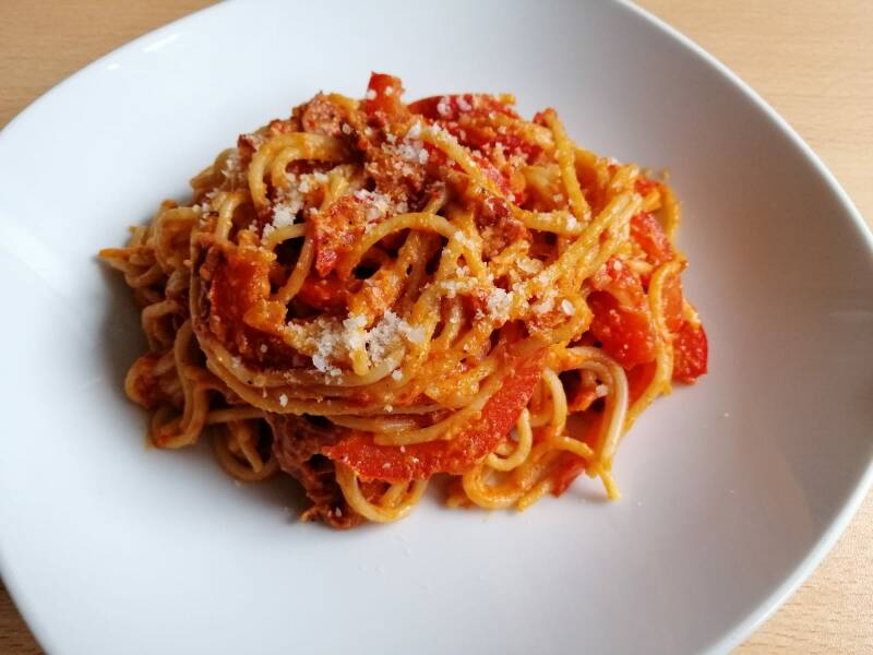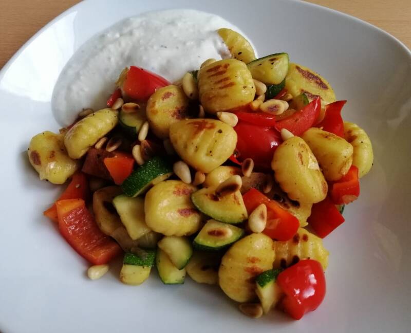 Tomaten-Gnocchi mit Paprika und Bratwurstscheiben