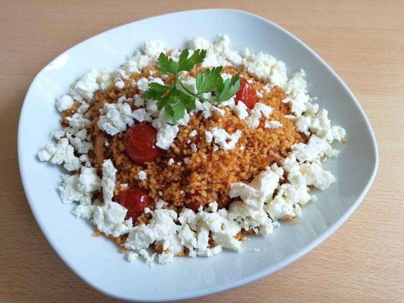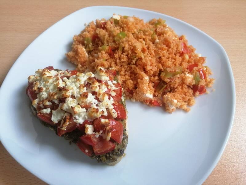 Putenschnitzel mit Pesto-Tomaten-Feta-Kruste und Tomaten-Couscous